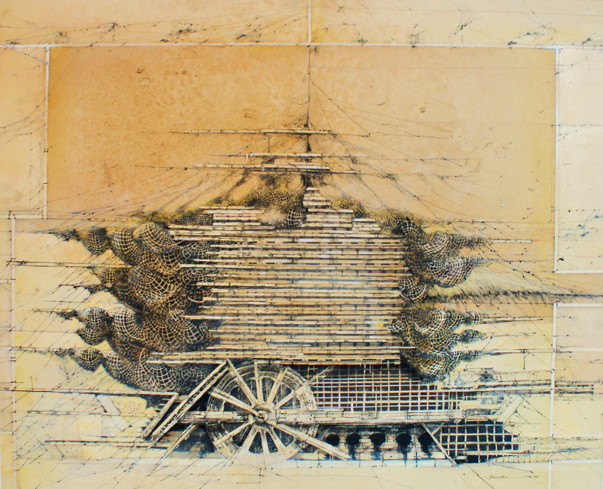 Los dibujo de manera completa tal como una interpretación de una opera prima. El sabor del grafito texturiza los suaves trazos de tinta de Jenaro, y luego de esa exacta interpretación viene el agua y el rodillo y como una tormenta de viento arrastra el polvo del grafito convirtiendo en niebla gris la poderosa máquina del tiempo.